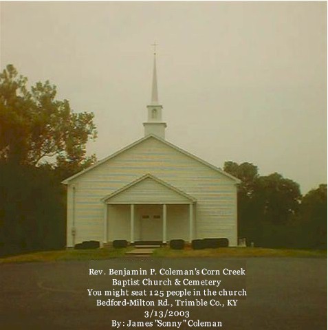 A note from Suzanne Shepard about the above photo of gravestone: "Rev. Ben Coleman was my "several" great-uncle. He was born in VA abt. 1749-51 and married Sarah Gutherie in 1771, VA. They moved to Trimble in the early 1800's and founded the church. He died in 1837 and is buried there."