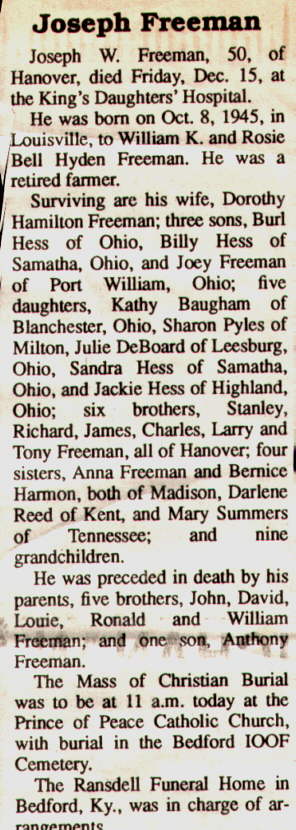 My grandparents were William and Rosie Freeman of Bedford Ky. I couldn't tell you how many years they lived there, but I know its at least 20 yrs. They lived on Brays Orchard and my Grandfather worked there many years along with many of his sons and daughters.I spent a great deal of my life on that farm.