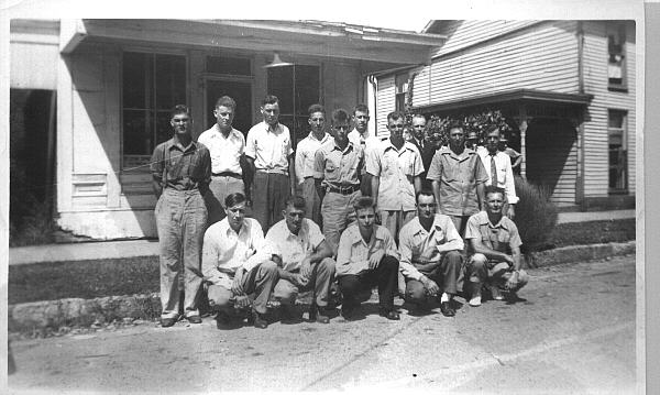 same group of men as in military32 file, but in a standing position. Written on back: Feb. 3, 1943. An arrow is pointing to the 8th gentleman from the left or 3rd from the right. He is identified as Eldred Fisher.