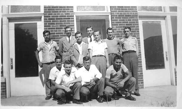 Oscar Aldridge is the third man in the front row. He is the son of Grover and Edna Aldridge. Grandson of George Fallis and Rebecca Aldridge. He was born November 27, 1921 in Trimble County. He served in U S Army Air Corps during WWII and was in the European Theater and was part of the march across Europe to defeat Hitler coming on shore at Utah Beach a day after D-Day as part VII Corps invasion.