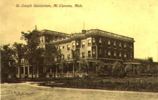 As of 1998, the St. Joseph Sanitarium located at 215 North Avenue, is the only remaining bath house in Mount Clemens. Built by the Sisters of Charity of St. Joseph, Cincinnati, Ohio, it was dedicated on November 21, 1899. One of the Sisters had come to Mount Clemens for the baths, was successfully treated, so suggested a sanitarium to be built. Four Sisters were sent to oversee the project, and ground was brokeen on November 2, 1898.