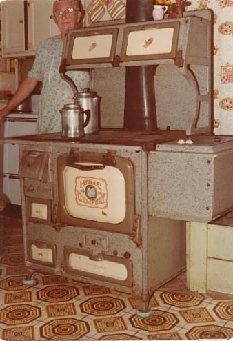 Cleo Aldridge Horine, standing beside stove that she used most of her